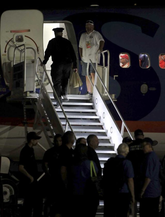 The Rev. Al Henderson, chaplain for the Fort Dodge Police, Webster County Sheriff’s Department, Fort Dodge Fire Department and Iowa State Patrol District 7, boards the Brushy Creek Area Honor Flight Saturday morning to bless the flight before its departure.