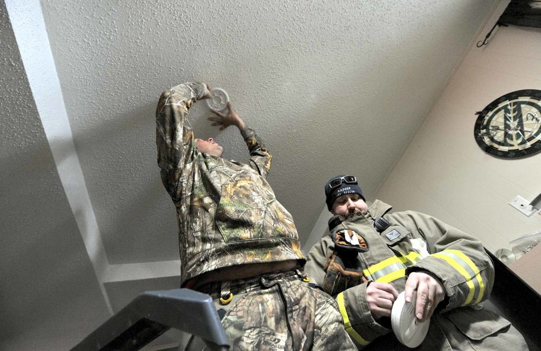 Badger firefighters Matt McClellan, at left, and Chad Swanson work to install a new smoke detecter in a Badger home Saturday morning during the department’s smoke detector blitz.