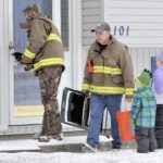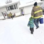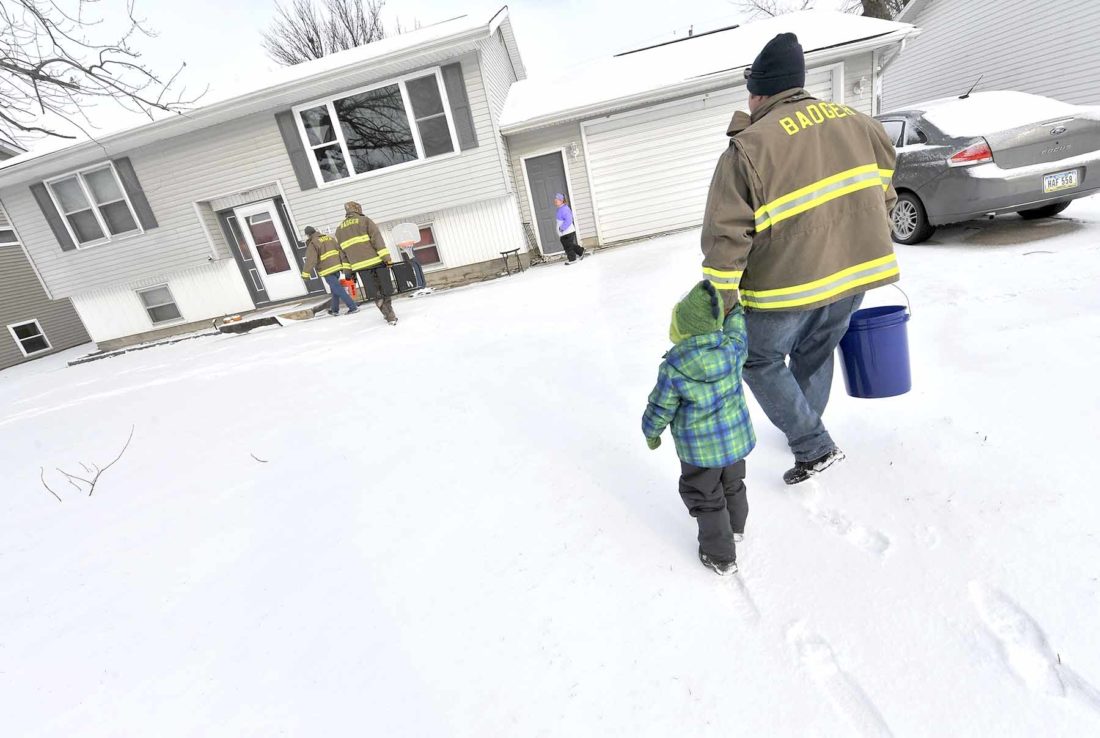 Badger firefighter Chad Swanson and his son, Cole, 3, approach a home to see if their smoke detectors are working properly Saturday morning during a smoke detector blitz.