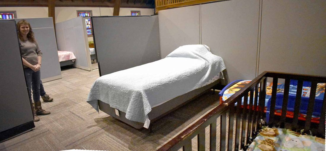 The shelter provides a place for women and their children who need a place to stay. The church’s sanctuary has been transformed into a living space, split up into cubicles using donated partitions.