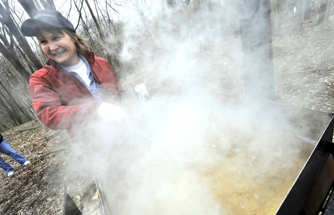 Webster County Conservation naturalist Karen Hansen keeps the boiling sap stirred and skimmed Saturday afternoon during the annual Syrup Festival at Camp WaNoKi. This year the event was jointly sponsored by Hamilton and Webster County Conservation.