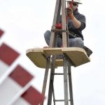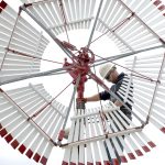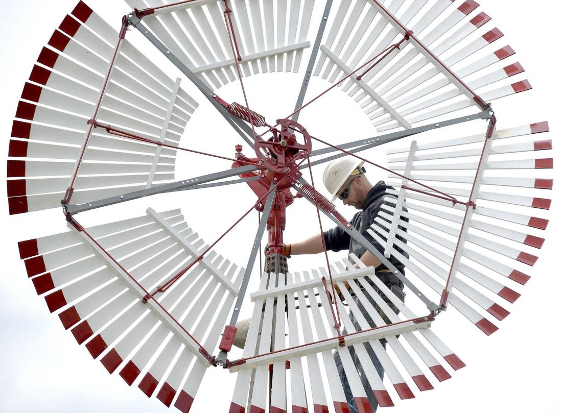 Phil Gehman, of Great Plains Windmill Service, makes some last-minute adjustments and checks the function of the restored windmill at the Fort Museum and Frontier Village.