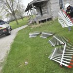 The metal parts are painted bright red. The blades are white with red tips. Gehman and his helper, Eddy Yoder, put the pieces of the windmill back together on the ground. Originally, when assembled on a farm, the parts would have been hoisted up and the machine assembled atop its tower.