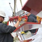 Phil Gehman, with Great Plains Windmill Service, adjusts a spring Tuesday as he works with Eddy Yoder, right, to put the Fort Museum and Frontier Village’s windmill back together before installing it on its tower.