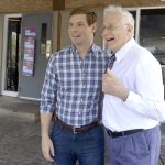 U.S. Rep. Eric Swalwell, left, who’s a candidate for the Democraric presidential nomination, poses for a photo with Steve Bakken, of Blue Earth, Minnesota, Saturday afternoon in Fort Dodge.