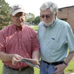Blair Redenius, left, and Bernie Weydert, both of Algona, look through pictures of the aftermath of the 1979 tornado that swept through the Algona community. Redenius and Weydert survived the twister.
