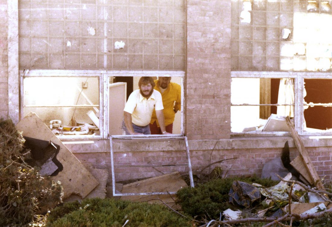 Bob Bowker, the principal of Bertha Godrey School in 1979, looks out a window of the school shortly after a tornado swept through the community.