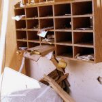 Cardboard and other materials that were in storage shelves inside Bertha Godfrey School in Algona, were damaged from the 1979 tornado.