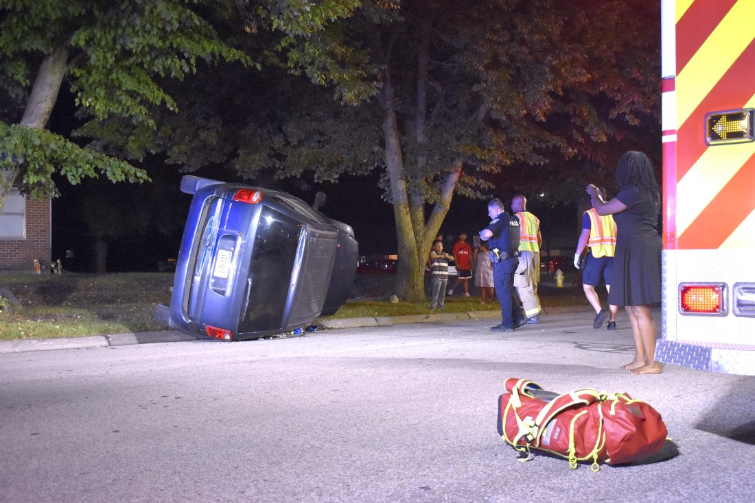 -Messenger photo by Elijah Decious A Chrysler Town and Country van was turned on its side in an accident in the 2200 block of Sixth Avenue North at approximately 9 p.m., across from St. Edmond Catholic School. The eastbound vehicle with three occupants suddenly experienced an unknown malfunction that veered it to the curb, flipping it on its side in the process. Sgt. Zach Stanley of the Fort Dodge Police Department said the front axle of the vehicle appeared to be broken, but could not immediately determine the cause of the single vehicle accident. No injuries were reported.