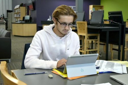 Sacha Colomban, an Iowa Central student, goes through notes on his Surface Go tablet in the Student Resource Center on Wednesday. Iowa Central now provides the devices for students to check out for the school year.
