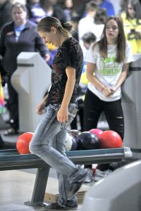 Katelynn Lindner, of Fort Dodge, is all smiles after a successful frame Thursday during the Special Olympics Bowling Tournament at Ridgewood Lanes in Fort Dodge.