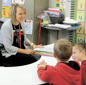 Kirstie Ron is shown with students in the first grade classroom at Duncombe Elementary where she co-teaches with Peggy Larson recently.