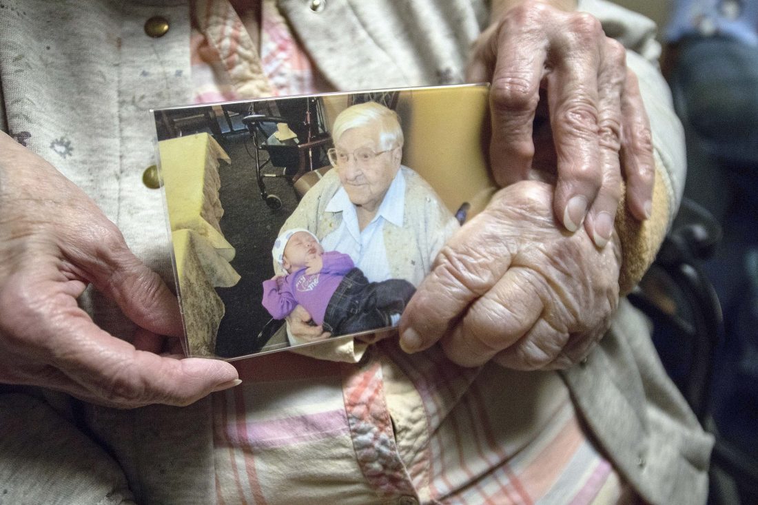 This photo from a few years ago shows Bessie holding one of the then newest members of the Hendricks family at the time. The hands helping Bessie Hendricks hold the photo are Bessie’s daughter Glenda.