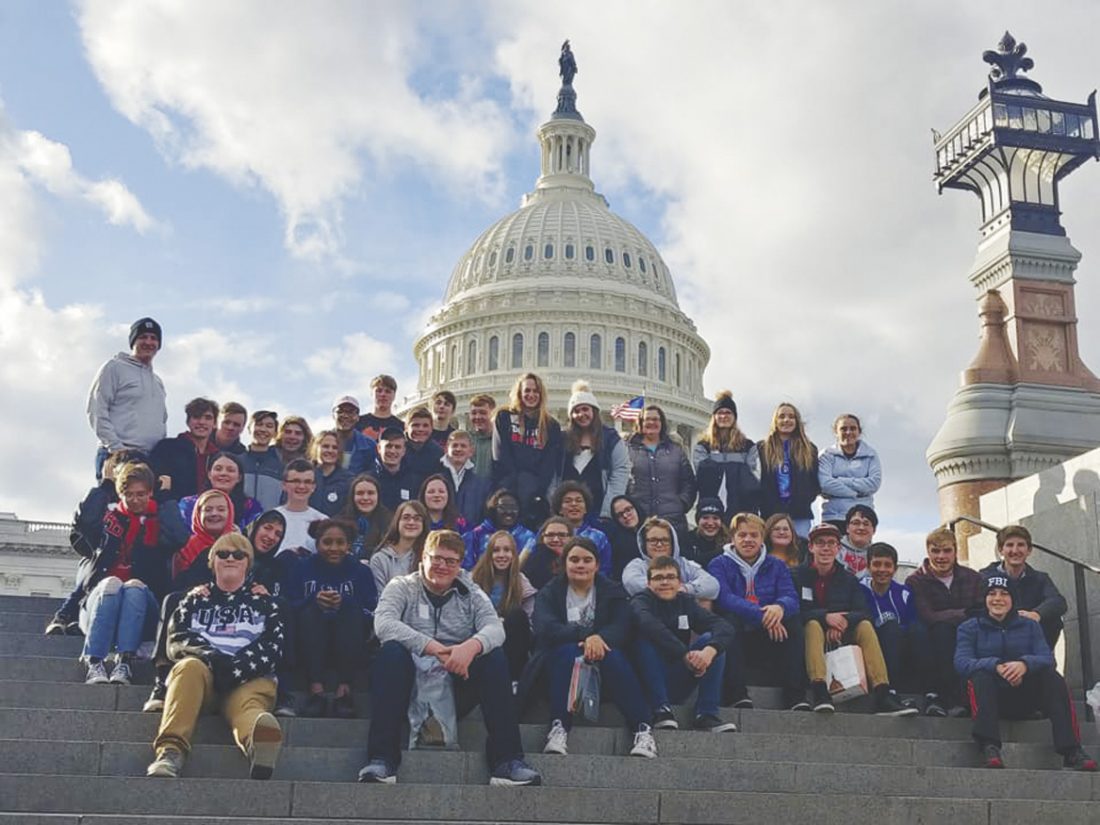 Fort Dodge Senior High students that traveled to Washington, D.C., in November sit in front of the capital.