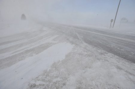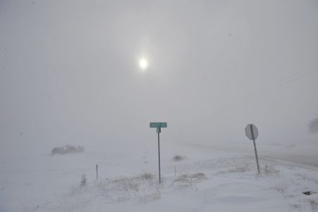 Blowing snow reduces visibility along Iowa Highway 175 just west of Dayton to almost nothing Saturday afternoon. Sustained winds of 30 miles per hour with 40 mile per hour gusts made travel hazardous.
