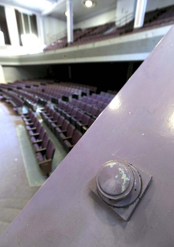 It’s all there: seats, curtains, lights, the knobs on the railings to keep students from sliding on them, the thick ropes tied to pegs that held up banks of lights and scenery, beautiful light fixtures in the ceiling and a piano or two.