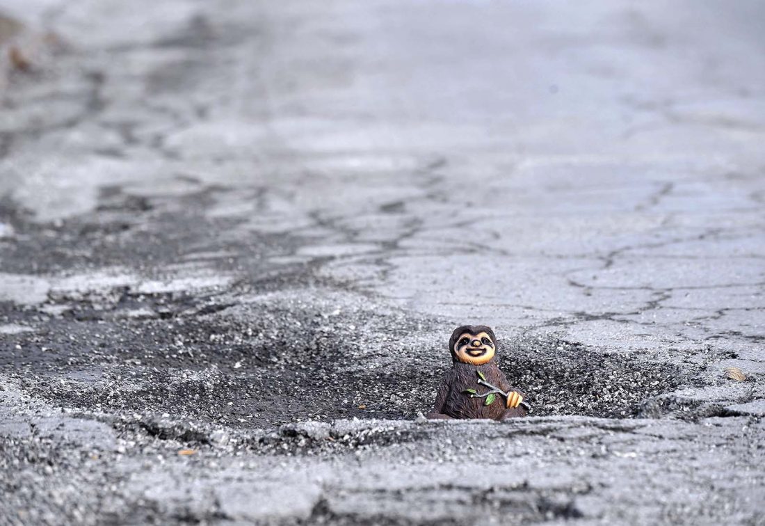 Sid the Pothole Sloth sits in a large pothole in the 1800 block of Eighth Avenue South that includes a piece of rusting rebar in the bottom. Sid, for the record, is about 8 inches tall. To report a pothole for Sid to visit, call 573-2141, ext. 472, or email hmadsen@messengernews.net. Potholes can also be reported to the city of Fort Dodge using the Connect Fort Dodge app or on the city’s website at fortdodgeiowa.org.