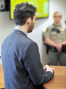 Blake Gibbins, of Lafayette, Colorado, makes his initial appearance in Webster County Magistrate Court in March 2019. Gibbins pleaded not guilty to two counts of assault and one count of disorderly stemming from an incident where he allegedly threw a glass of water at U.S. Rep. Steve King, R-Kiron, at Mineral City Bar & Grill, 2621 Fifth Ave. S. in Fort Dodge. Gibbons went on to face federal charges in the incident and was sentenced to two years probation.
