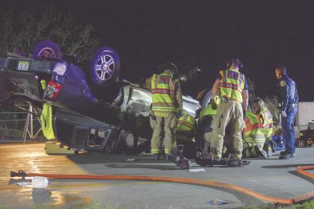 Emergency personnel work to extract driver Edward Newsome-Crooks, 29, from his overturned Ford F-150 pickup truck following a single-car rollover accident on Lainson Avenue on Sunday night.