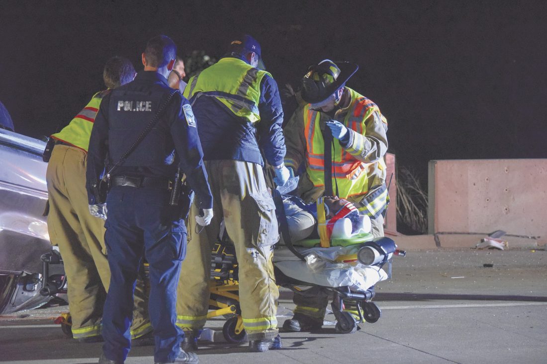 Emergency personnel prepare to transport driver Edward Newsome-Crooks, of Fort Dodge, to UnityPoint Health — Trinity Regional Medical Center, for treatment following a single-car rollover accident on Sunday night. Newsome-Crooks was alert and responsive when paramedics arrived.