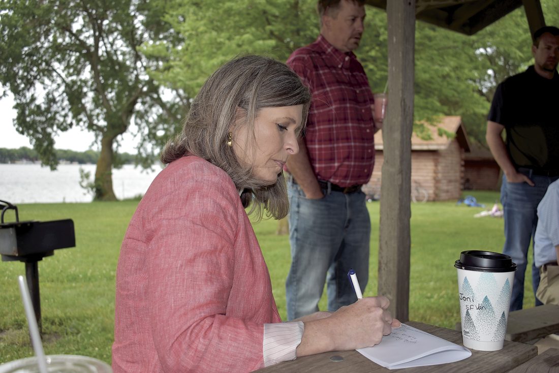 -Messenger photo by Chad Thompson U.S. Sen. Joni Ernst jots down some notes Saturday during a meeting with Calhoun County Economic Development at Featherstone County Park in Manson.