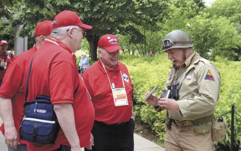 Brandishing two flasks, World War II re-enactor John Liszewski, of Maryland, asks Air Force veteran Pete Oppedahl, of Fort Dodge, center, if his shots are up to date. Liszewski greeted the Brushy Creek Area Honor Flight at the World War II Memorial in Washington, D.C., in May 2019.