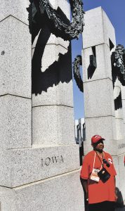 John Brown poses with the Iowa column at the World War II memorial during the Brushy Creek Area Honor Flight in September 2019.