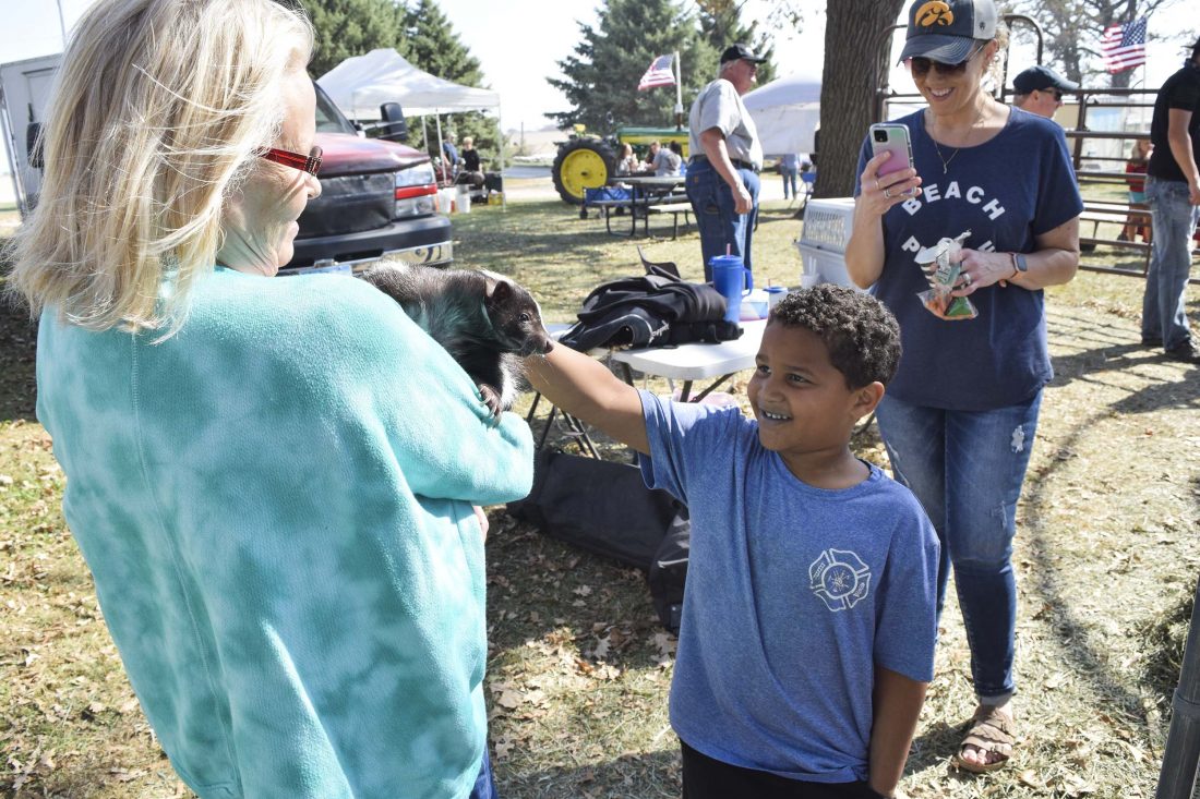 Jax Allen, 6, of Humboldt, pets Stinkerella the skunk as owner Bertie Wilson, of Humboldt, holds her at Pumpkins and Ponies on Sunday afternoon.