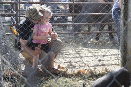 Dillon Brundige, of Gilmore City, and his daughter Espyn, 3, say hello to the piglets in the petting zoo at Pumpkins and Ponies on Sunday afternoon.