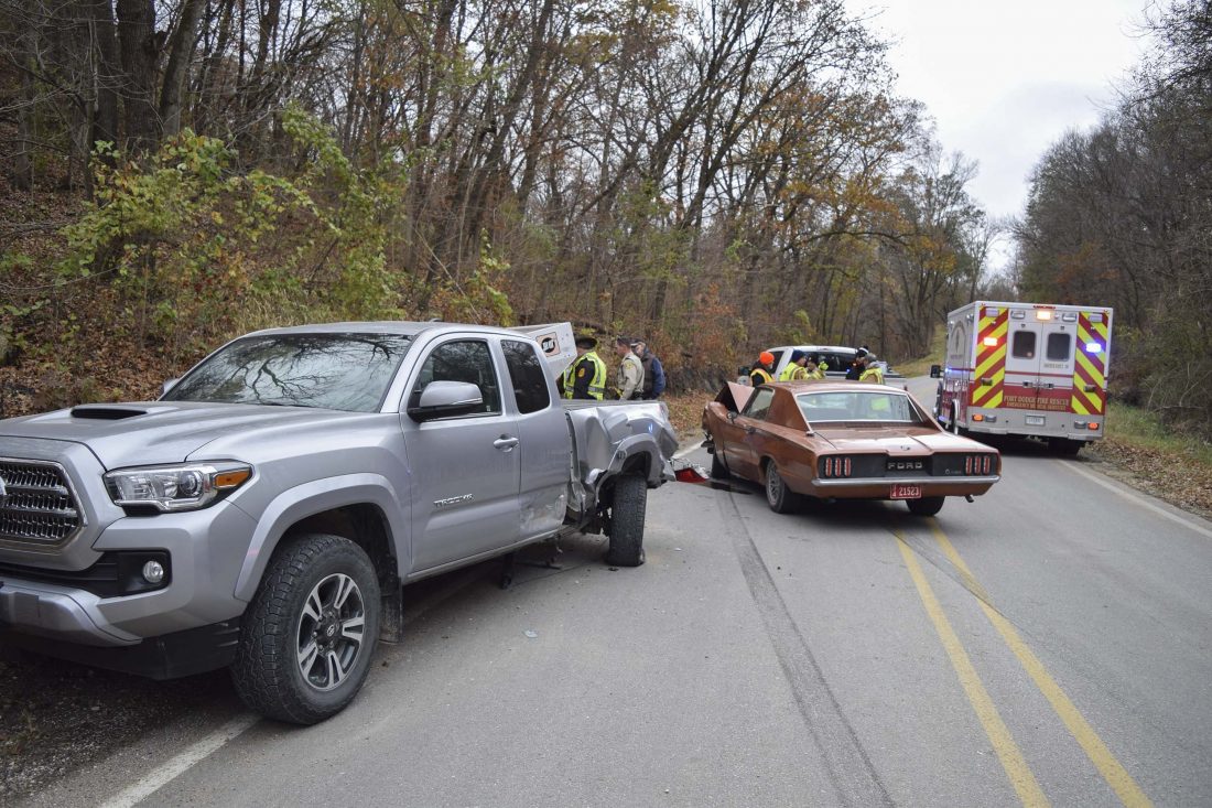 -Messenger photo by Kelby Wingert A 1966 Ford Thunderbird driven by Thomas Krough, 60, of Otho, was traveling southwest on School Street between Otho and Kalo at approximately 2:40 p.m. when it crashed into a 2016 Toyota Tacoma driven by Alan Deal, 67, of Fort Dodge. Scott Johnson, 64, of Callendar, a passenger in the Thunderbird, was transported to UnityPoint Health - Trinity Regional Medical Center for treatment of “non-incapacitating injuries.”