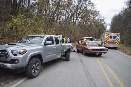- -Messenger photo by Kelby Wingert A 1966 Ford Thunderbird driven by Thomas Krough, 60, of Otho, was traveling southwest on School Street between Otho and Kalo at approximately 2:40 p.m. when it crashed into a 2016 Toyota Tacoma driven by Alan Deal, 67, of Fort Dodge. Scott Johnson, 64, of Callendar, a passenger in the Thunderbird, was transported to UnityPoint Health – Trinity Regional Medical Center for treatment of “non-incapacitating injuries.”