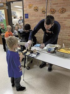 Bret Larson, principal of Manson Northwest Webster Elementary School in Barnum, helps serve lunch during the 2019-2020 school year.