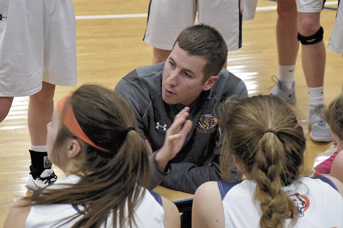 - -Submitted photo Bret Larson, principal at Manson Northwest Webster Elementary School, talks to the school’s girls basketball team at a past game. Larson has served as MNW’s head girls basketball coach for nine years.