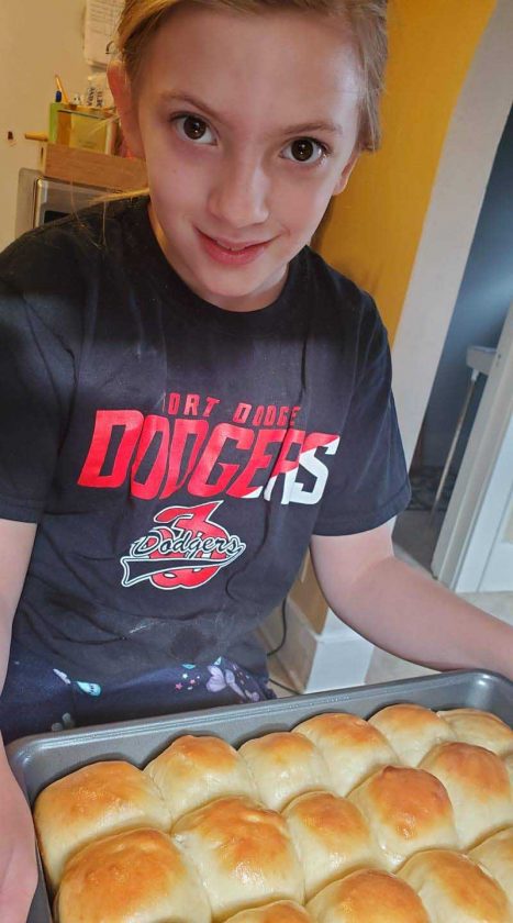 Lauren Schelle, a fourth-grader in the Douglas Dreamers 4-H Club, shows off the homemade dinner rolls she baked for her family in November during a Zoom workshop with her club.