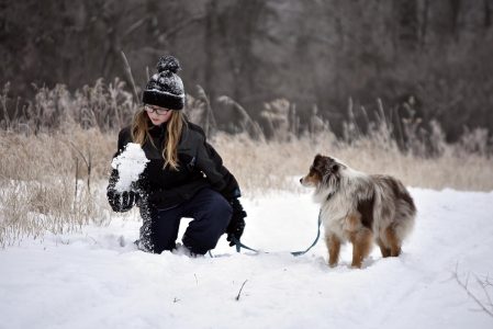 Ash, the miniature Australian shepherd, watches Nash Terry, 10, play with fresh, powdery snow on New Year’s Day at Brushy Creek State Recreation Area.