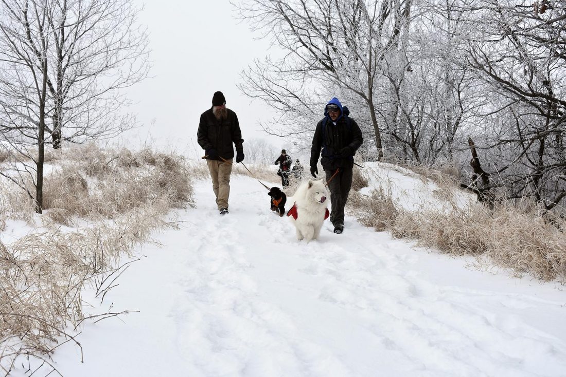 Rossi, a white Samoyed on her second New Year’s Day hike in the woods, excitedly pulls owner Pete Wilcox, of Webster City, through Brushy Creek State Recreation Area.