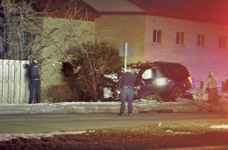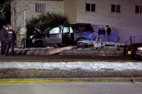 A shattered utility pole lies next to a crashed sport utility vehicle next to the Maggio Building on Fifth Avenue South Thursday evening. The crash ended a police pursuit that began on U.S. Highway 20 in Hamilton County. The driver was checked by paramedics before being taken into custody by the Iowa State Patrol. The incident remains under investigation by the State Patrol. The Fort Dodge police and fire departments, the Webster County Sheriff’s Department and MidAmerican Energy were on scene at the crash.