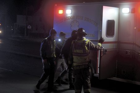 - – Messenger photo by Bill Shea Fort Dodge police officers and firefighters confer at the scene of a Thursday evening crash on Fifth Avenue South that happened at the end of a police pursuit that started on U.S. Highway 20 in Hamilton County. The sport utility vehicle in the background went off Fifth Avenue South, knocked down a utility pole and came to rest against some shubbery and the Maggio Building. The driver was taken into custody by the Iowa State Patrol.