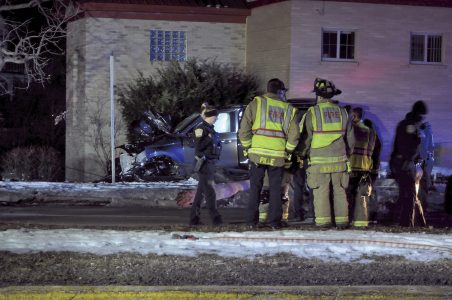 Fort Dodge police officers and firefighters confer at the scene of a Thursday evening crash on Fifth Avenue South that happened at the end of a police pursuit that started on U.S. Highway 20 in Hamilton County. The sport utility vehicle in the background went off Fifth Avenue South, knocked down a utility pole and came to rest against some shubbery and the Maggio Building. The driver was taken into custody by the Iowa State Patrol.