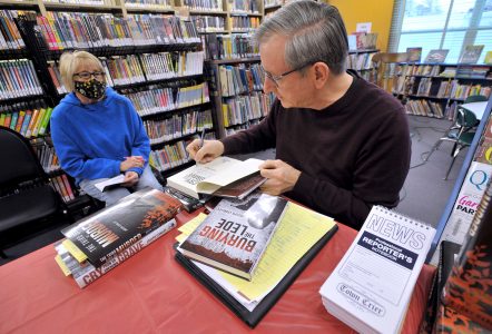 Iowa author and Dayton native Joe Levalley signs a copy of “Cry From An Unknown Grave,” for Cheryl Toyne, of Dayton, during a book signing and author’s talk at the Dayton Public Library. All three books follow the adventures of fictional Iowa reporter Tony Harrington. The notebooks are printed with the logo of the fictional Orney Town Crier.