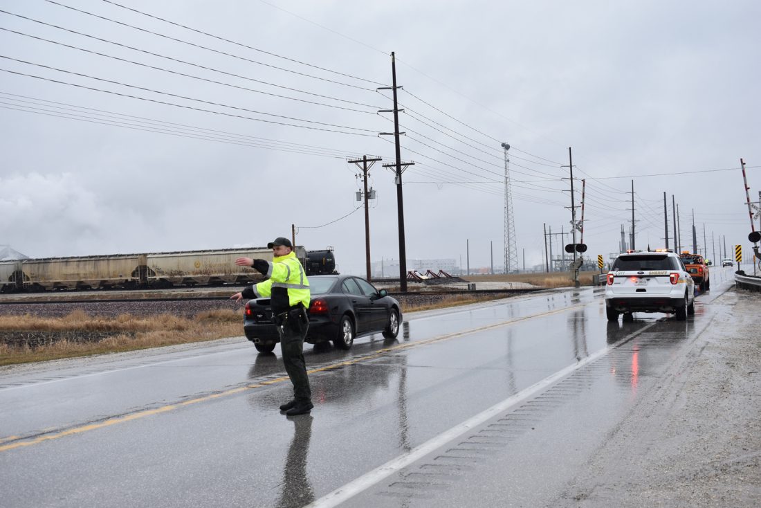 A Webster County sheriff’s deputy directs traffic along Iowa Highway 7 Tuesday. Only the eastbound lane could be used to go across the Union Pacific Railroad tracks after it was determined a large piece of concrete was sticking up in the westbound lane.