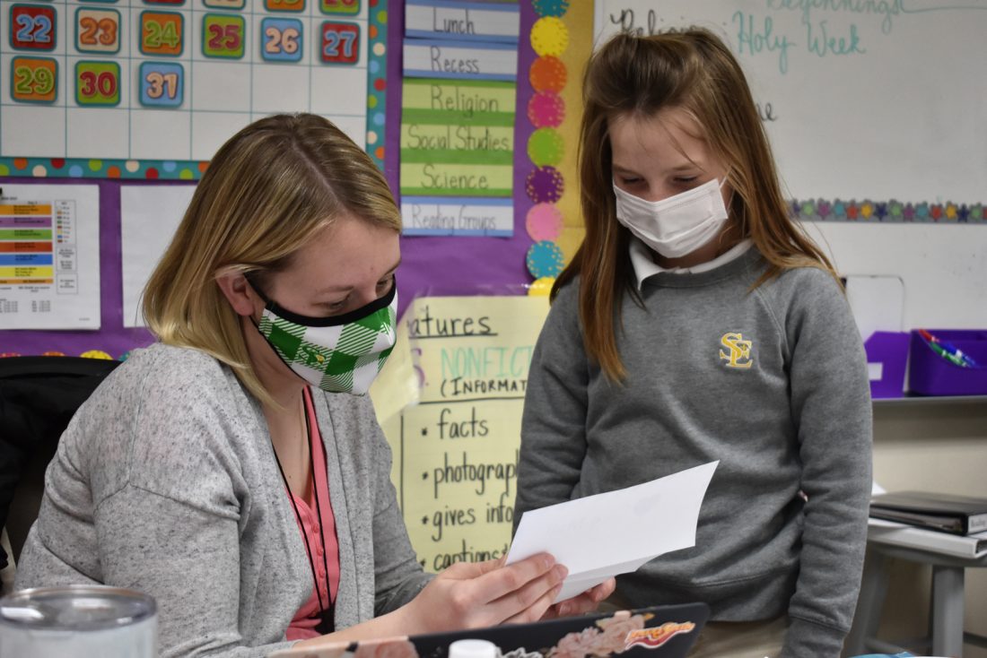 Ashley Doster, a fourth grade teacher at St. Edmond Catholic School, left, looks over a letter sent to Grace Schlegel, 9, one of her students. Schlegel was sent the letter by a Marian Home resident through the Care Mail program started by UnityPoint Health – Trinity Regional Medical Center.