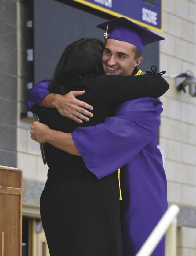 Jack Van Diest gives his mother, Beth Van Diest, school board president, a hug as she awards him his diploma. Van Diest was one of 121 students to receive their diplomas from Webster City High School Sunday afternoon.