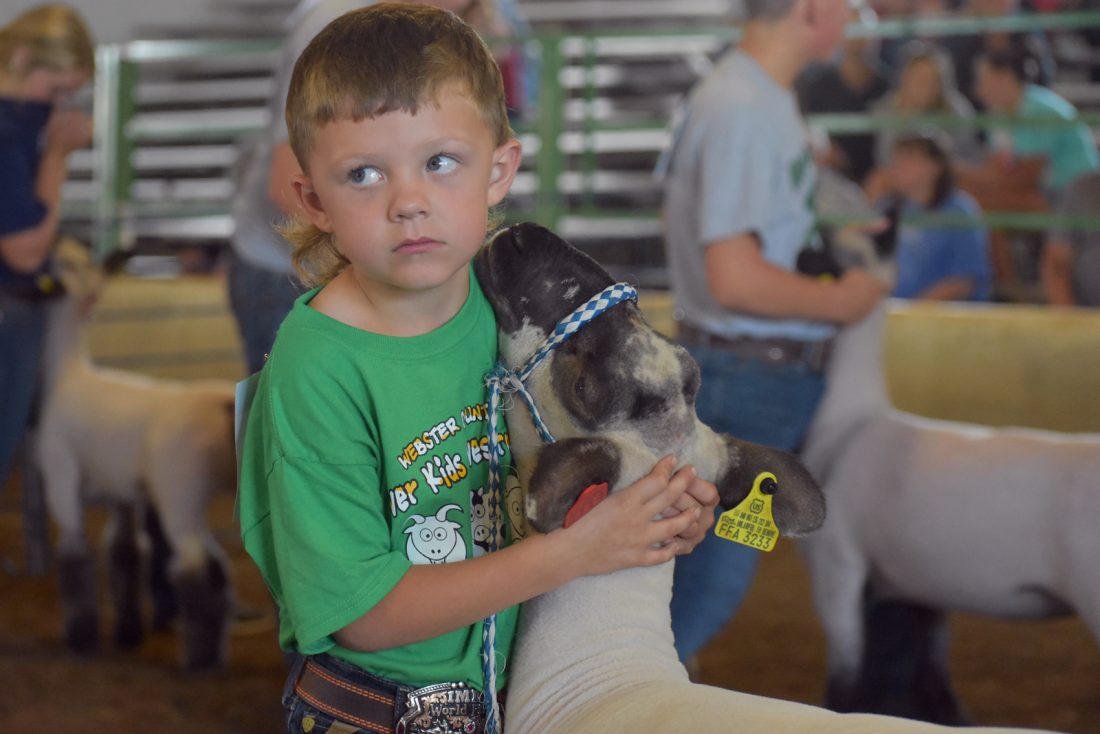 Layne Condon, 6, of Clare, looks on as he holds a sheep during the sheep show at the Webster County Fairgrounds on Thursday. Condon is a member of the Clover Kids club.