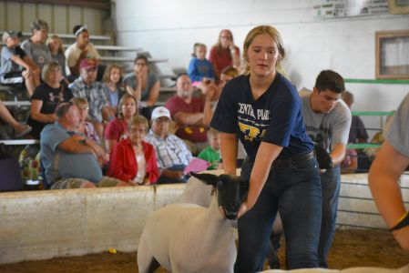 Haylee Welter, 17, of Gowrie, shows her sheep during the sheep show at the Webster County Fairgrounds on Thursday. Welter is part of the Central Plains FFA.