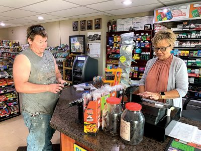 Kris Stringer, right, rings up a purchase on July 27 by Mason Phillips of nearby Duncombe at the Stop & Shop service and grocery store in Coalville. Stringer has owned the store since 2011.