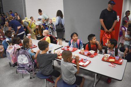 Kindergarten students enjoy their first breakfast at the Early Childhood Center on Tuesday morning.