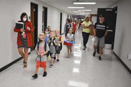 Kindergarten teacher Shawn Russell leads some of her students to their classroom on the first day of school at the Early Childhood Center on Tuesday morning.