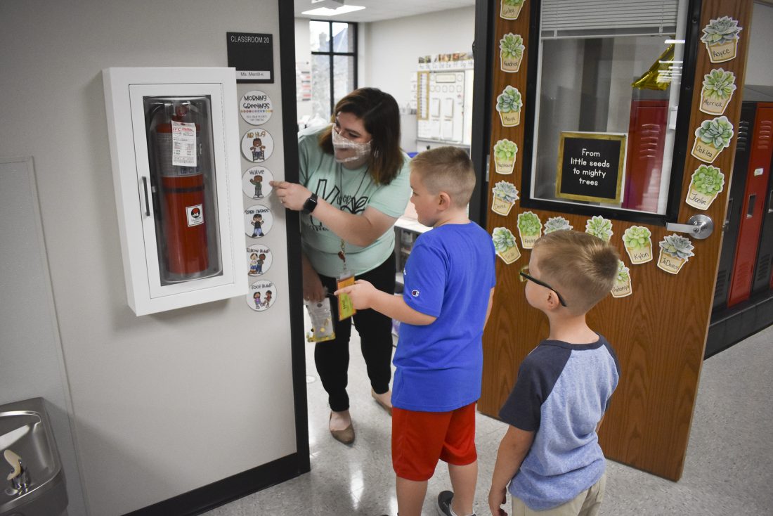 Kindergarten teacher Morgan Merrill shows some students the options for a morning greeting on the first day of school.