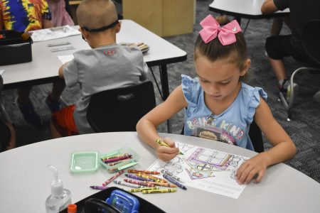 Harlow Davenport, a kindergartner in Shawn Russell’s class, concentrates on her coloring during some down time on the first day of school at the Early Childhood Center.
